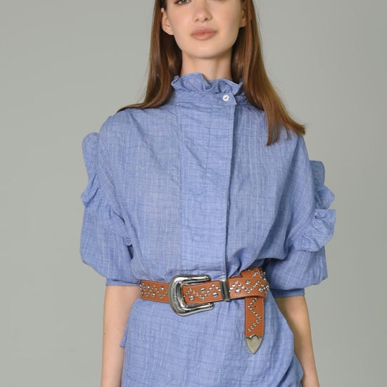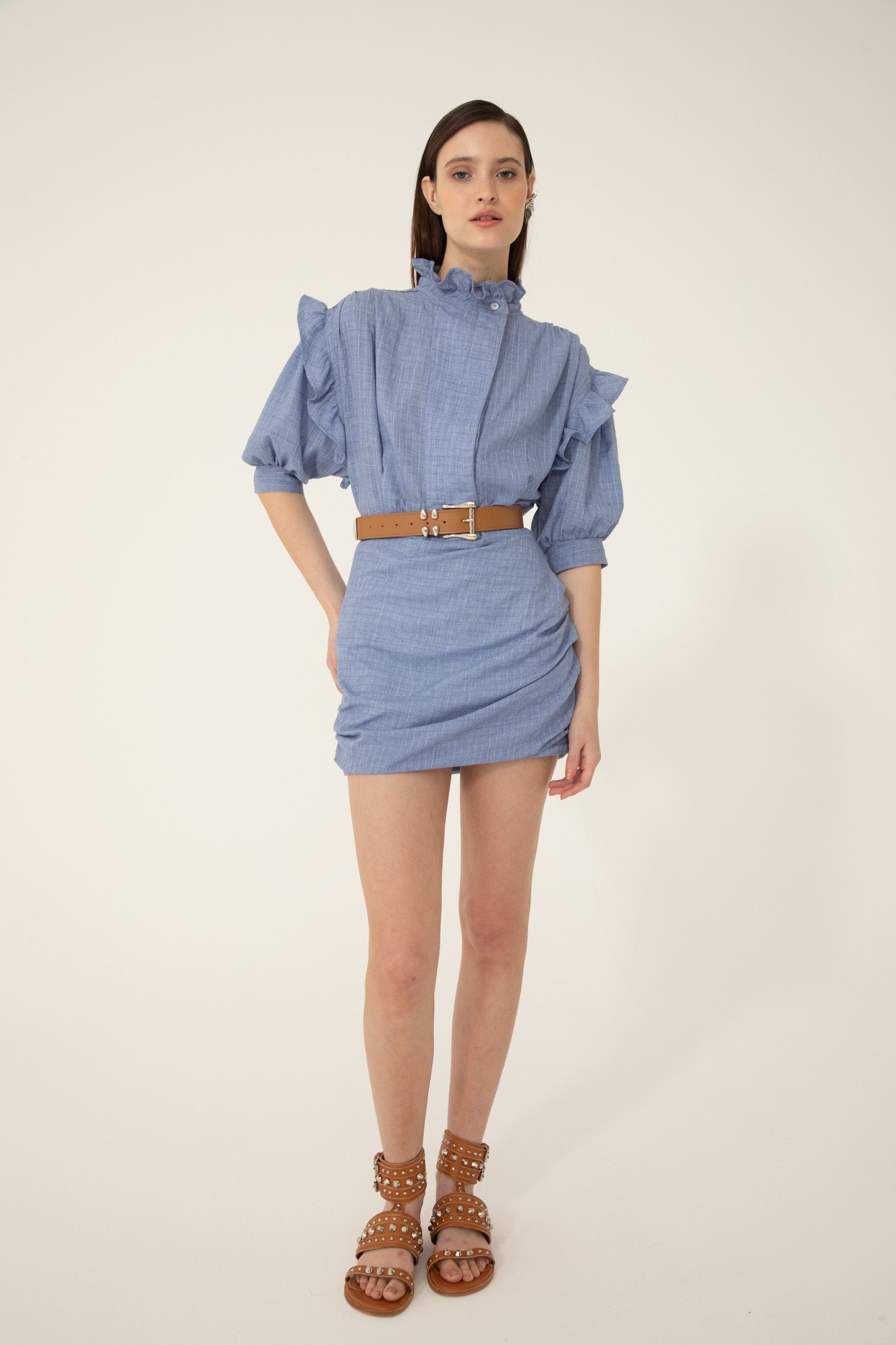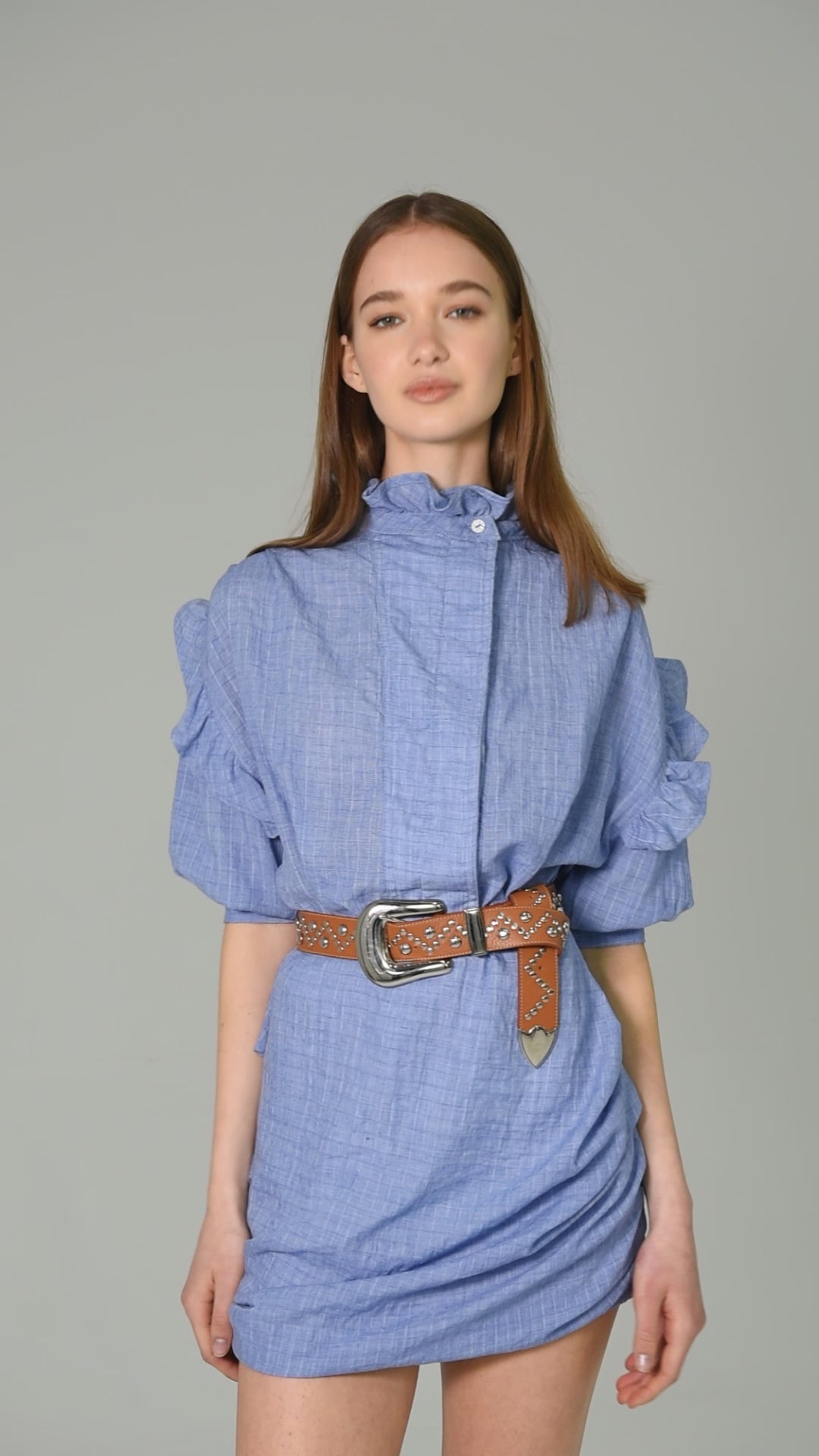 Vestido en algodón fantasía con mangas 3/4 con volados. Tiene cartera oculta con botones en delantero y volados en cuello. La parte de la falda tiene frunces en laterales. Fit recto y largo regular por arriba de la rodilla.