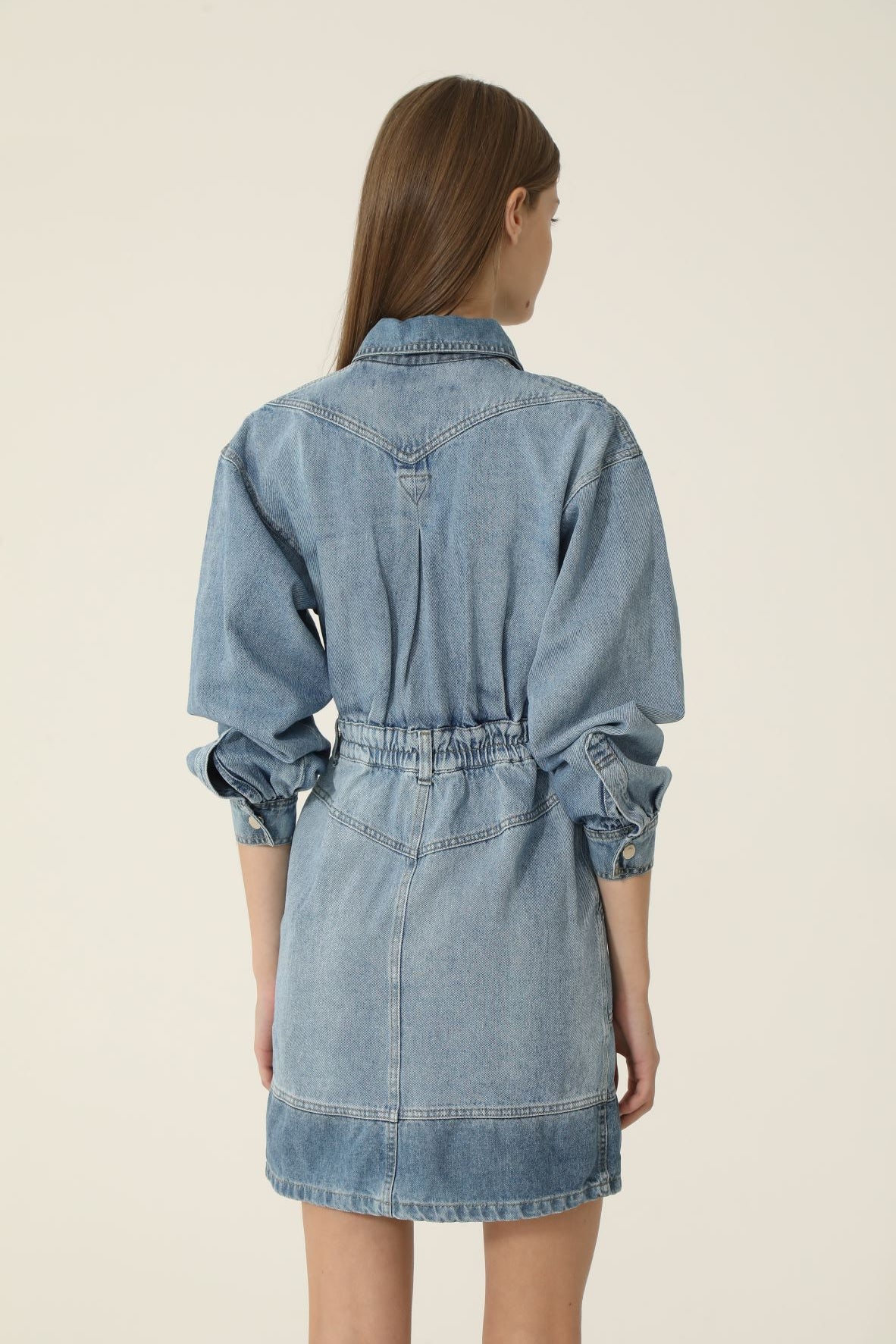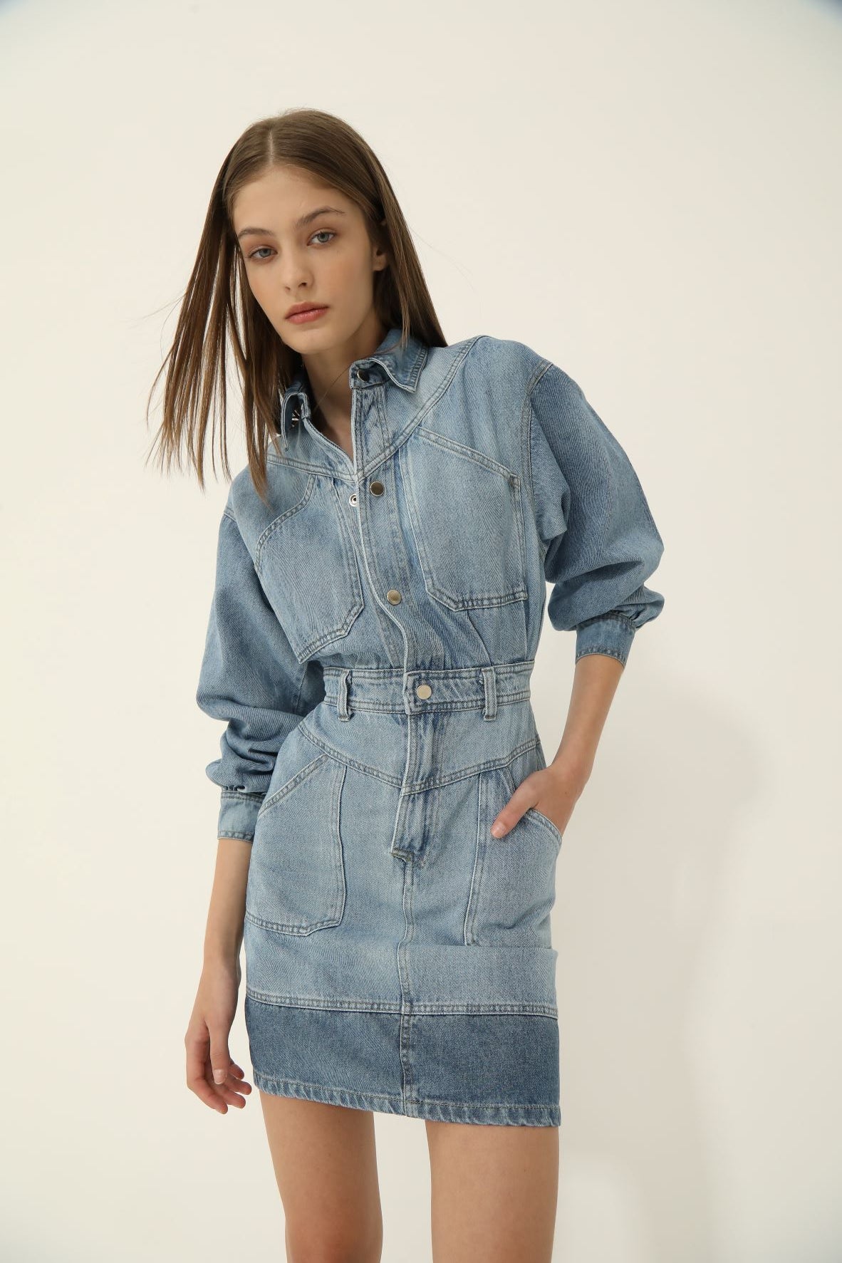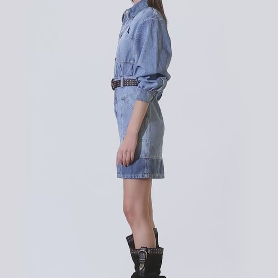 Vestido en denim de algodón con lavado artesanal. Tiene mangas largas con volumen, bolsillos delanteros en la parte superior y en la inferior. Tiene broches metálicos como acceso en la parte superior del vestido y fit recto.