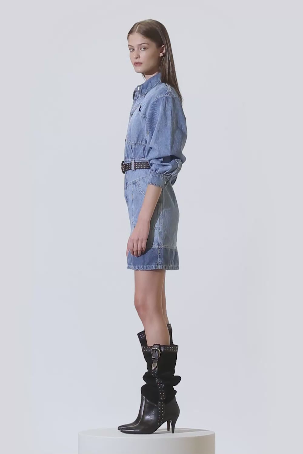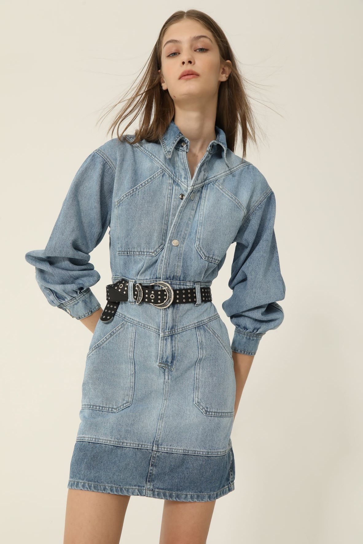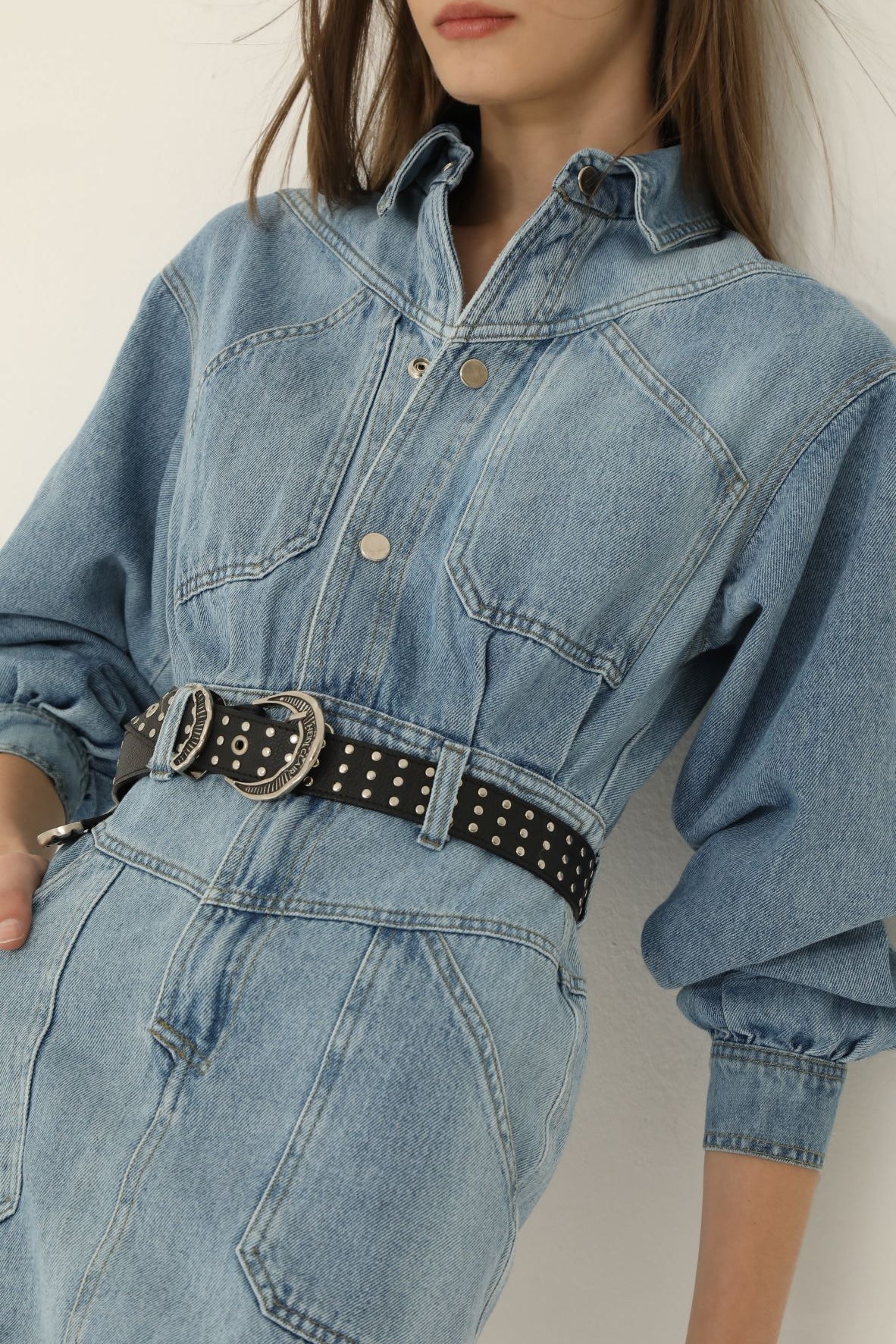 Vestido en denim de algodón con lavado artesanal. Tiene mangas largas con volumen, bolsillos delanteros en la parte superior y en la inferior. Tiene broches metálicos como acceso en la parte superior del vestido y fit recto.