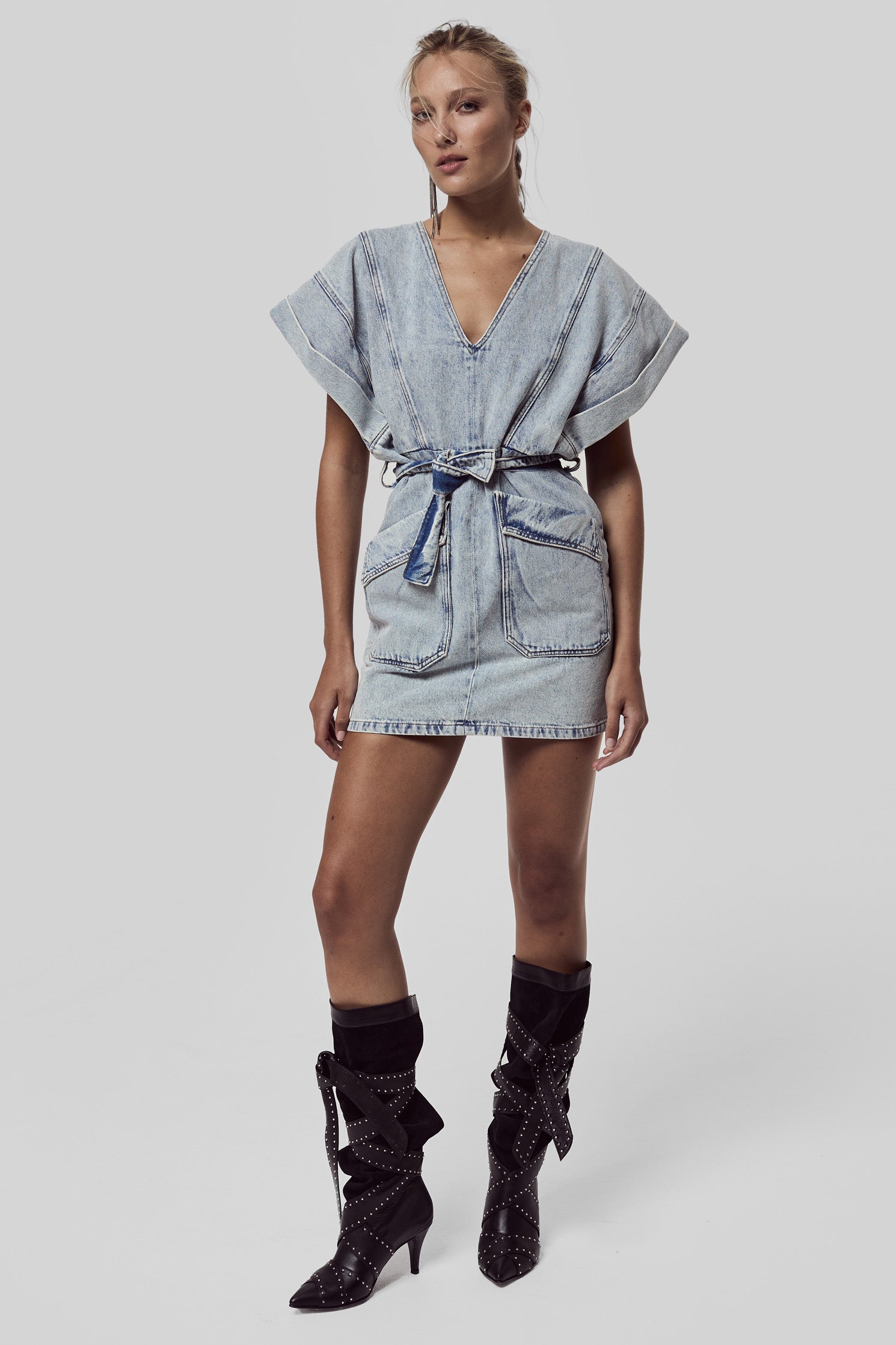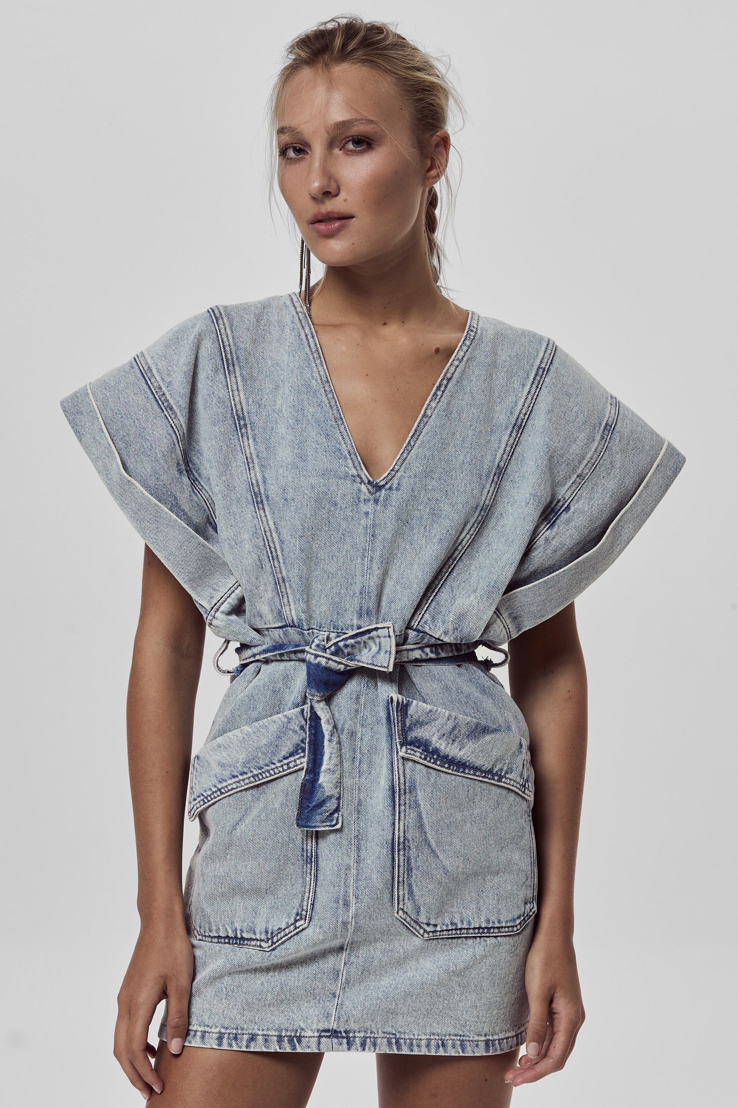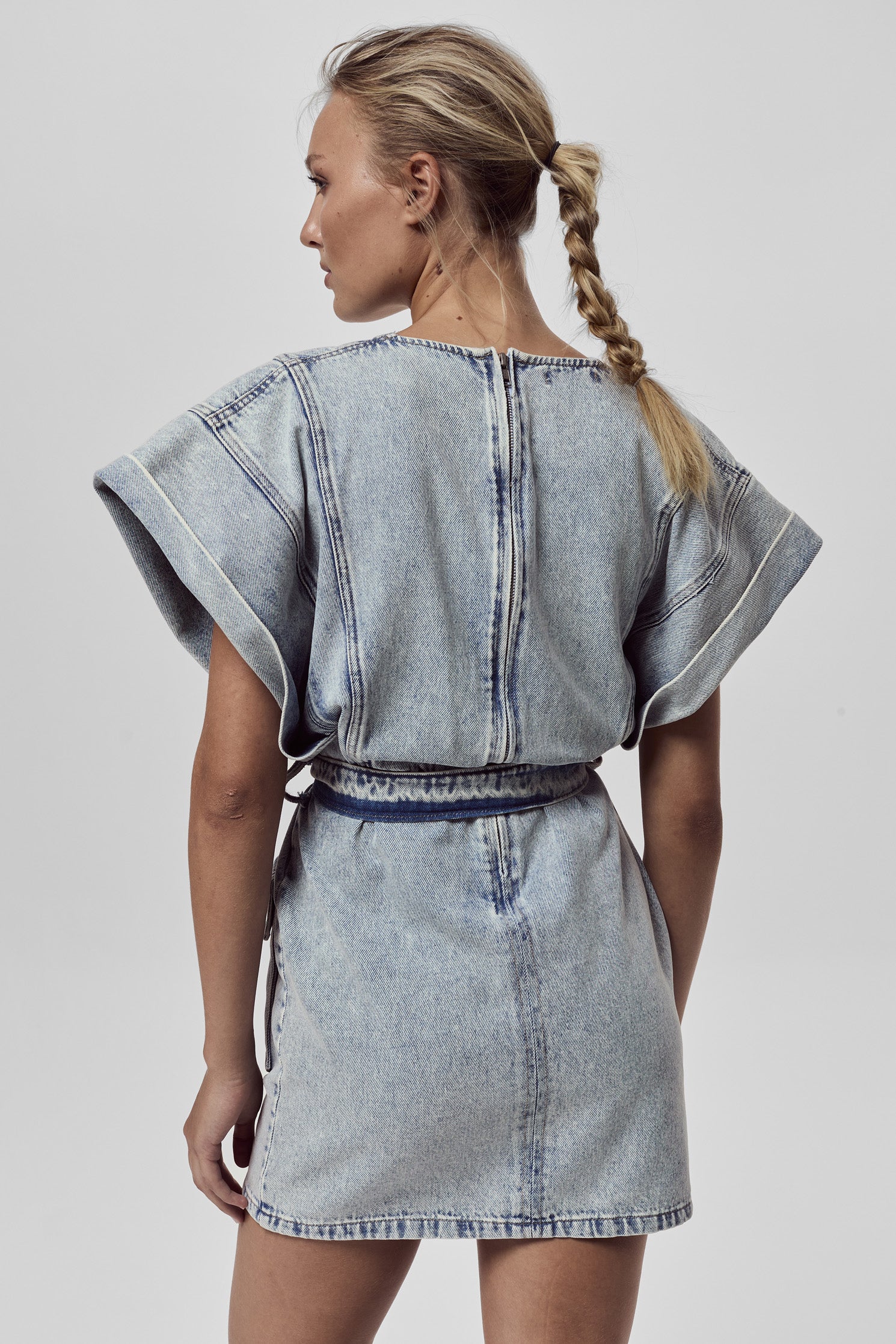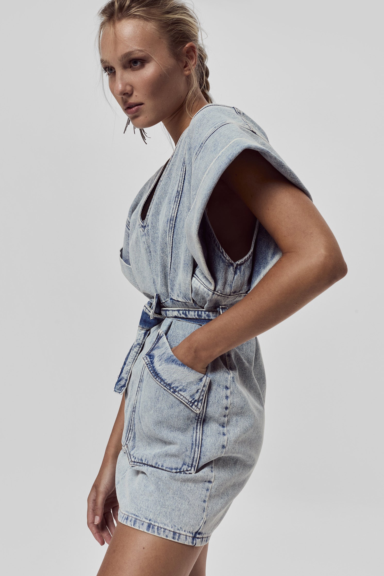 VESTIDO CORTO DE FIT REGULAR CONFECCIONADA EN DENIM 100% ALGODÓN. CON ESCOTE “V”, HOMBRO CAÍDO Y ARREMANGADO EN SISA. POSEE CIERRE EN ESPALDA PARA ACCESO A LA PRENDA.