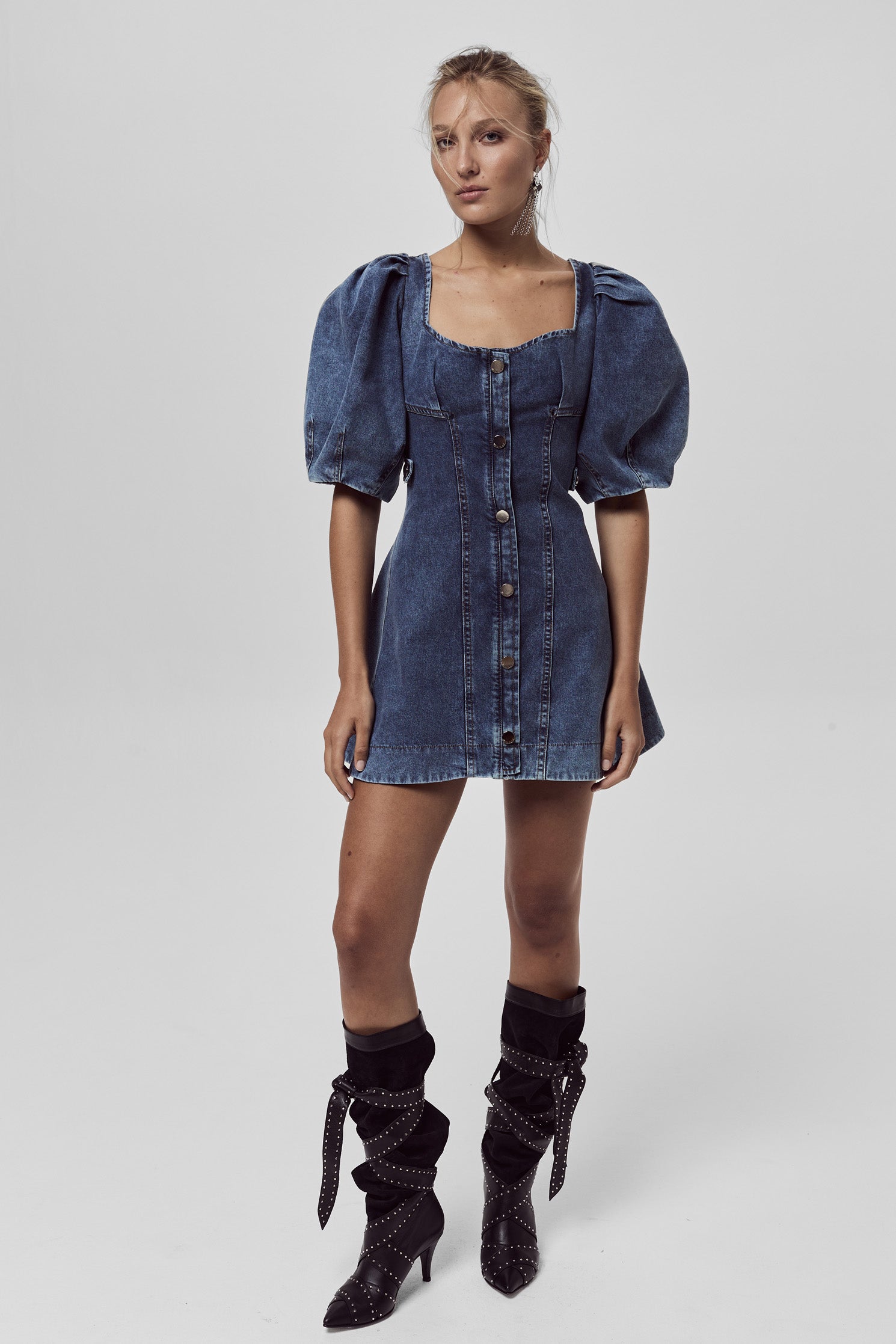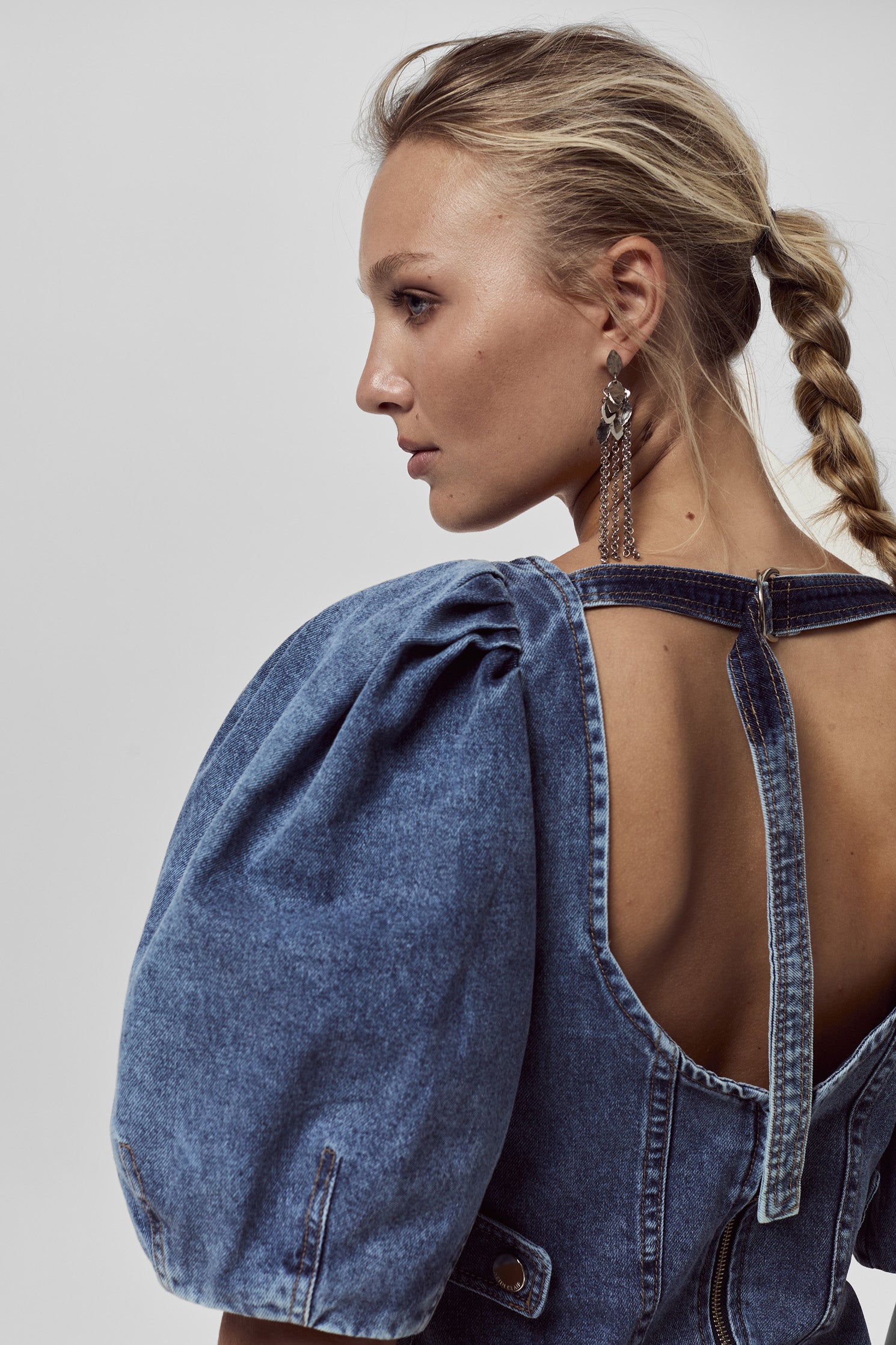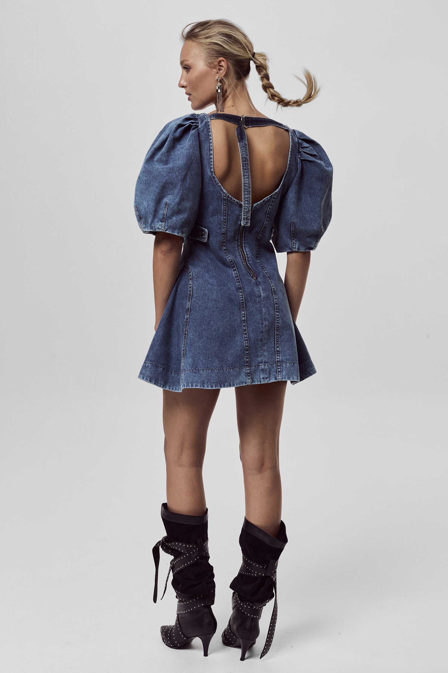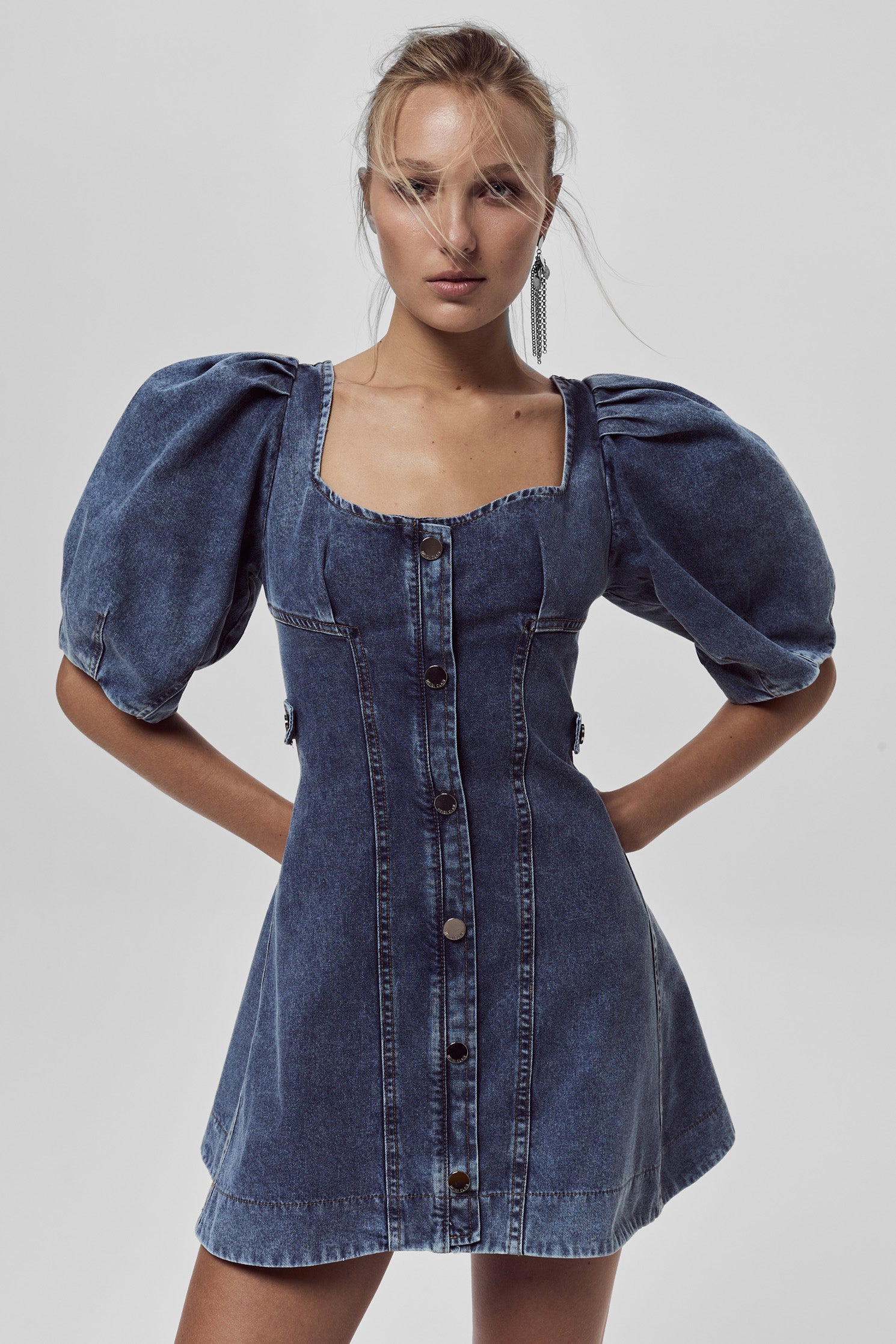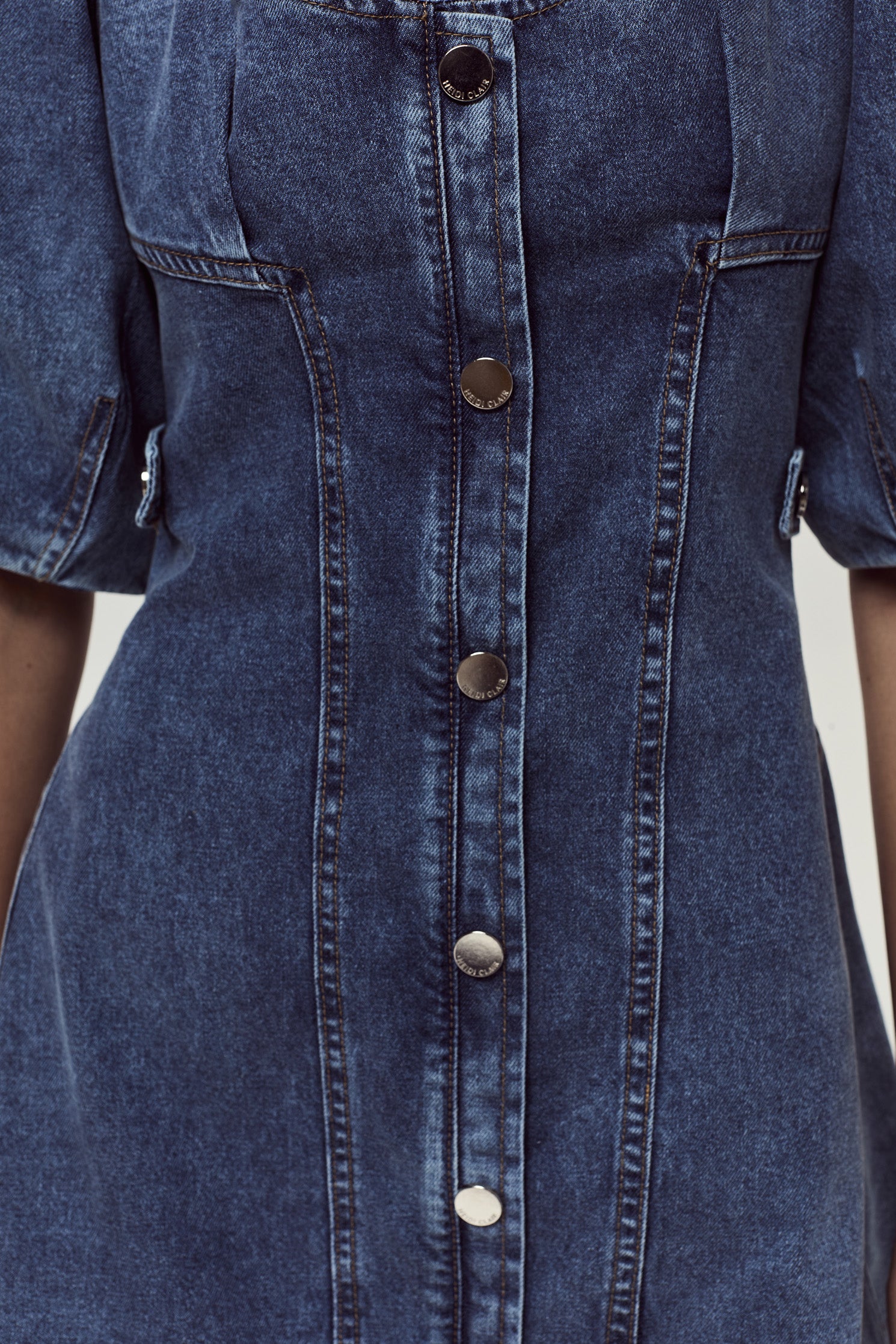 VESTIDO CORTO CON SILUETA EVASEÉ AJUSTADO EN LA CINTURA Y CON MANGAS CORTAS VOLUMÉTRICAS. CONFECCIONADO EN DENIM 100% ALGODÓN. POSEE BROCHES EN CENTRO DELANTERO Y TIRAS EN LA ESPALDA CON HEBILLA PARA ACCESO A LA PRENDA.